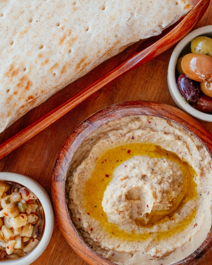 Levantine Spread, Pickled Eggplant, Olives, Pita