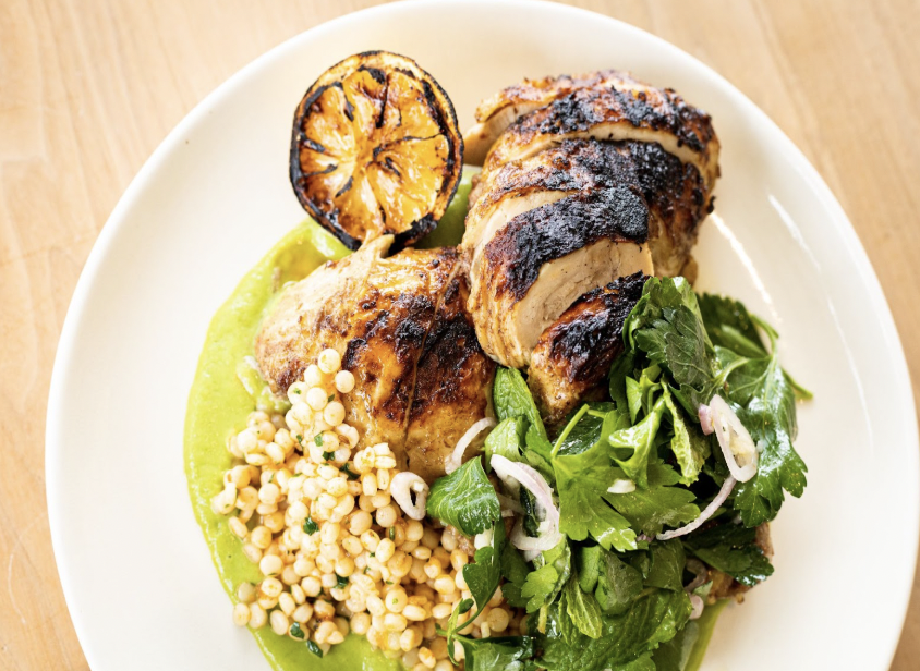 zucchini puree, harissa couscous, charred lemon