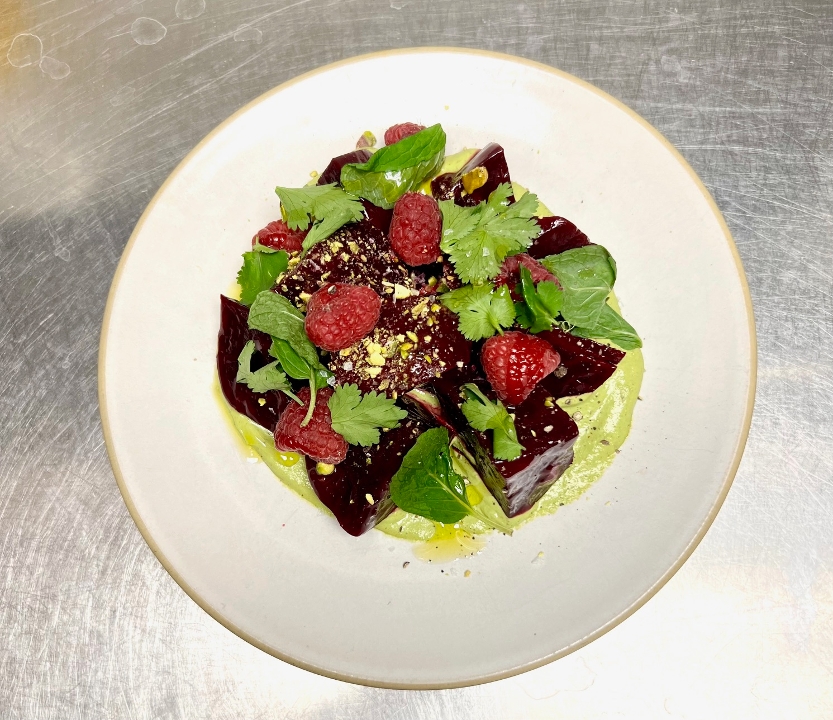 raspberry ispahan, pistachio tahina, mint, cilantro