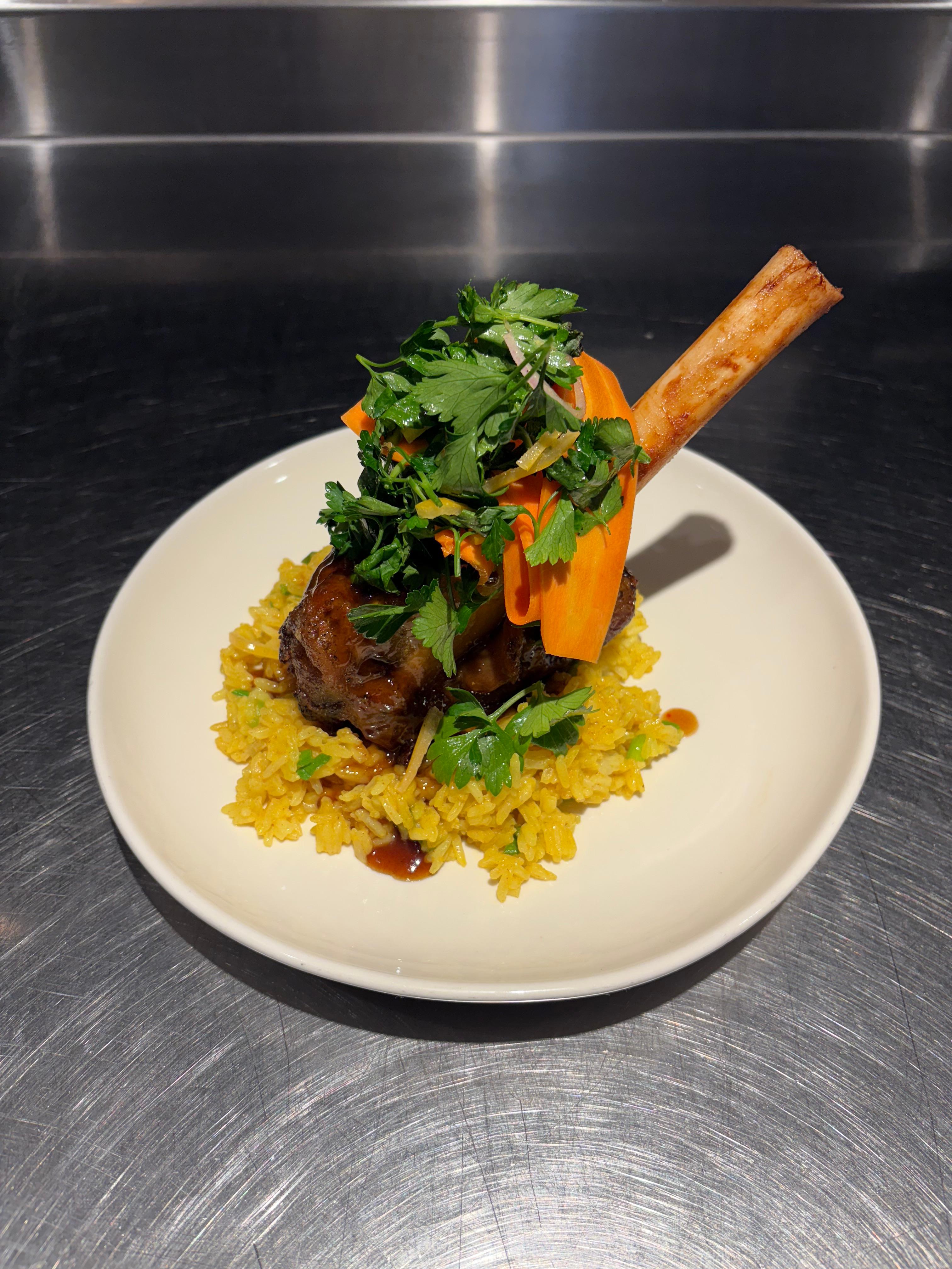 turmeric rice, pickled carrot salad, preserved lemon