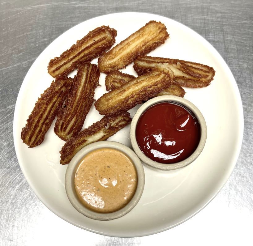 potato churros with garlic, ketchup, harissa mayo
